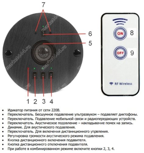 Акустическая помеха типа ""хор голосов"". Кроме УЗ излучения, прибор может генерировать особую слышимую помеху, которая накладывается на запись, производимую на диктофон, делая ее полностью неразборчивой. Такую помеху невозможно удалить. На корпусе устройства имеется регулятор уровня громкости акустической помехи.